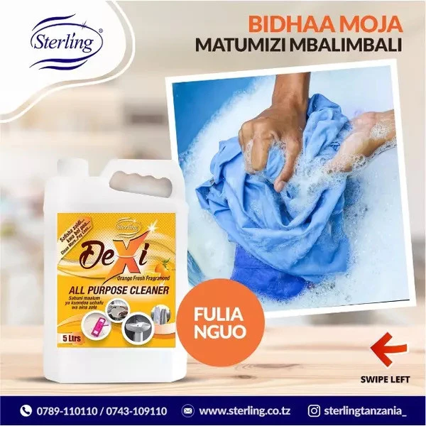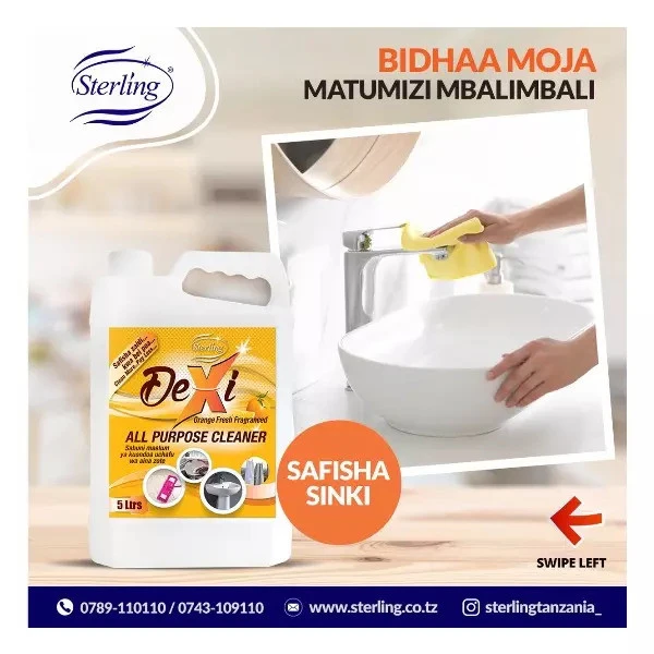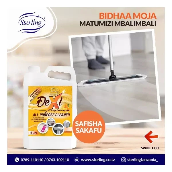 Dexi All Purpose Cleaner - suluhisho lako kamili la kusafisha sakafu, vyombo, na nguo. Inapatikana kwa ukubwa wa lita 5 na lita 1, hii ni Sabuni yenye nguvu sio tu inayoshughulikia uchafu kwa ufanisi bali pia inaacha harufu safi ya machungwa.
