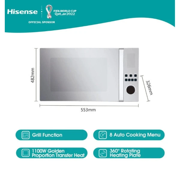 Hisense 45 Liter Microwave Oven & Grill Function Child Safety Lock Color Silver Model – H45MOMK9 – ( International Version ).We aspire to become the most reliable household brand globally, with more than a century of brand heritage. We aim to continually pursue technological innovation to improve your overall quality of life and make these technologies accessible to millions of families. Whether it’s for baking or broiling, Hisense Convection Function features fan-assisted heating for an even circulation of hot air, cooking your food efficiently and in a uniform manner and turning any dish into a deliciously cooked meal. Cleaning your oven has never been this easy! Hisense Easy Clean Stainless Steel Cavity is equipped with a high-temperature resistant feature for an enduring, shiny and clean finish. Hisense Crispy Grill feature transforms your meats, vegetables and seafood dishes into perfectly grilled meals complete with delicious golden brown crispy skin on the outside and a juicy, succulent and flavorful texture on the inside. By combining a strong grilling mechanism with accurate and dispersed hot air circulation within the oven, the Healthy Air Fry technology ensures that your food is cooked to perfection both inside and out. With a single droplet of oil, your dishes are crispier, healthier and more delicious than ever. Product Dimensions ( L x W x H ) 55 x 32 x 48 cm 18Kg.