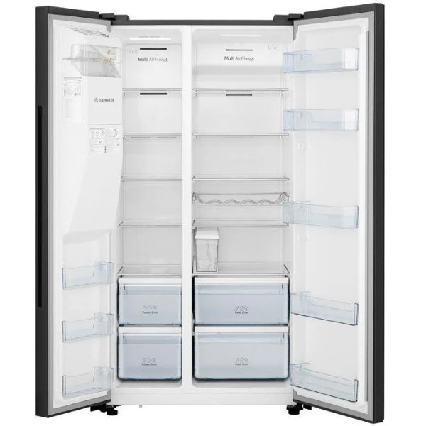 Hisense 535L Black Glass Side by Side Fridge has an A+ energy rating, multi airflow cooling system and a tall ice and water dispenser. Thanks to the Super Cooling and Freezing, the temperature will be lowered for a short period of time to keep fresh shopping at the correct temperature. Premium black glass door design, this stunning fridge allows for more space with room to spare. With doors that close automatically, this beautiful design will be the perfect fit for any household and comes standard.